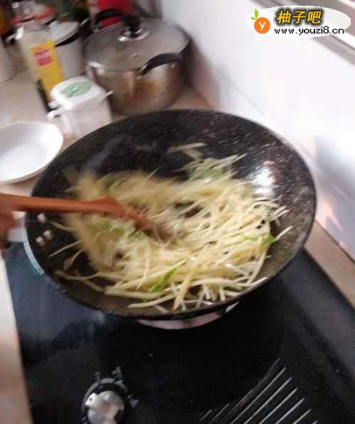 6第六步:将锅烧热加入食用油然后将土豆丝放入翻炒,加入调味料继续翻炒