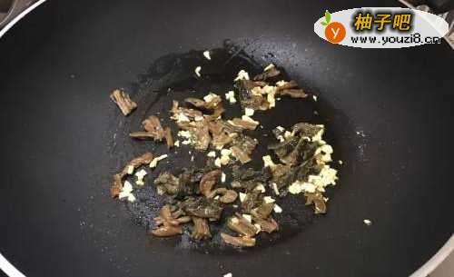 3锅内放入少许油,爆香蒜末,再放入梅干菜炒香