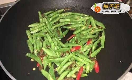 4随后放入四季豆、辣椒,拌炒匀后放入少许水,盖上锅盖,待熟后,试吃看看,若不够咸再加少许盐