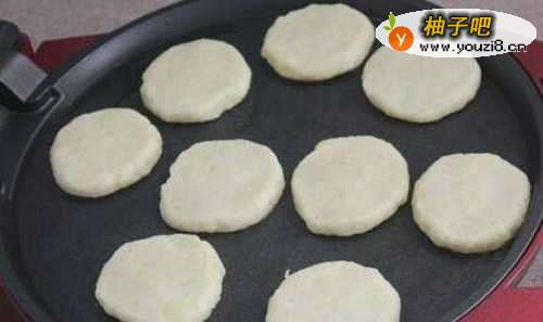 5将土豆泥搓成大小均匀的团子,在面粉里滚一下,拍去多余的面粉之后将两面轻轻压平,然后入油锅中煎