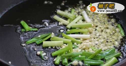 5锅中倒适量油烧至五成热,炒香葱段和蒜末