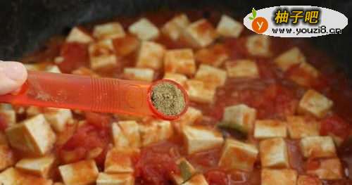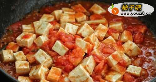 7再放入豆腐块晃动锅子,使豆腐裹上西红柿的汤汁