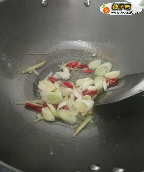 3将切好的葱姜蒜辣椒,温油入锅,翻炒出香味。