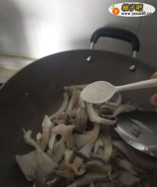 4将洗净的平菇撕成小瓣,倒入锅中,撒少许盐。翻炒均匀。