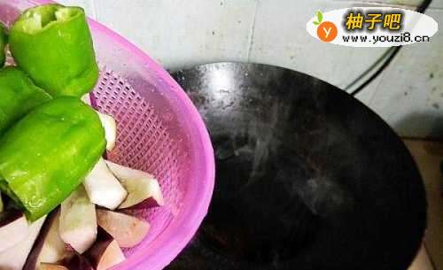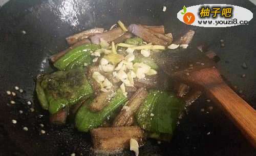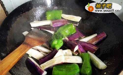 6煸炒茄子与辣椒,滴入料酒生抽适量,焖煮2分钟