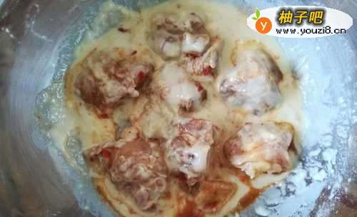 4鸡块先放在面糊里搅拌均匀,再放在面包屑里打个滚,可以下油锅炸啦!