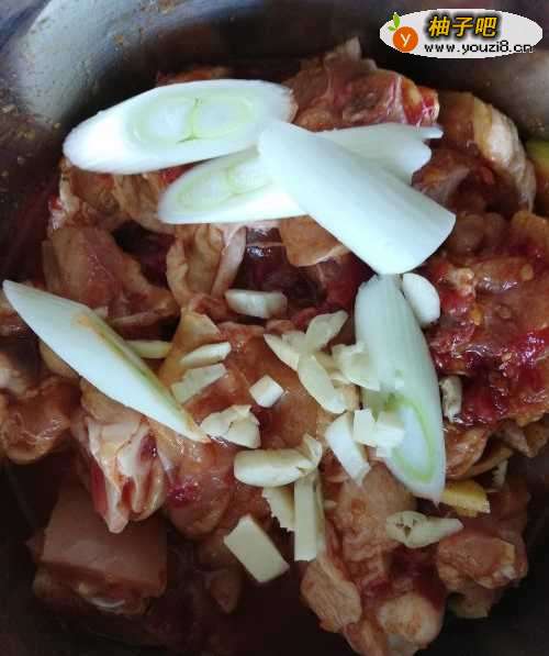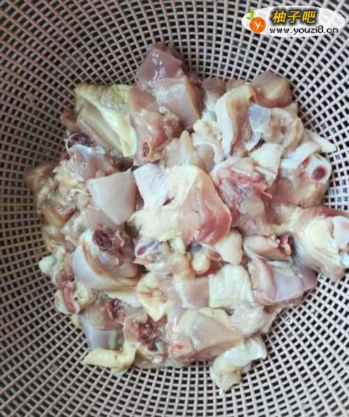 鸡大腿剁成小块,清水泡洗干净。