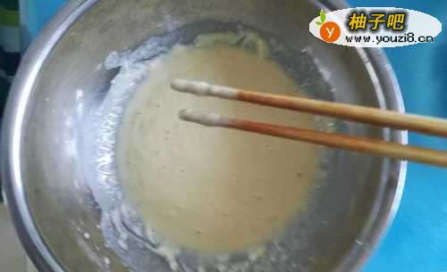 3另用一碗,倒入面粉,打入两个鸡蛋,搅拌成略稀的面糊。