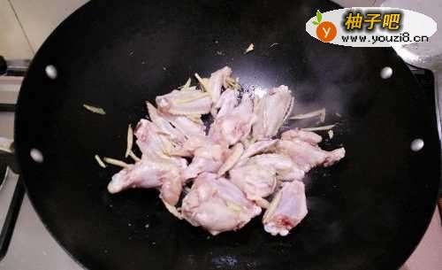 4将鸡翅倒进锅里,放点盐后翻炒一会,倒上一些水。
