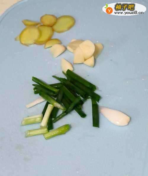 首喝虚哨先把姜切成片葱切成段蒜也切片,备用败季