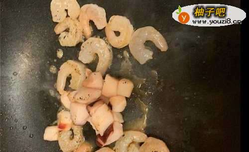 2南瓜切开去籽洗净,肉粒用锅炒到约3-4成熟,再放入南瓜盅蒸15-20分钟。