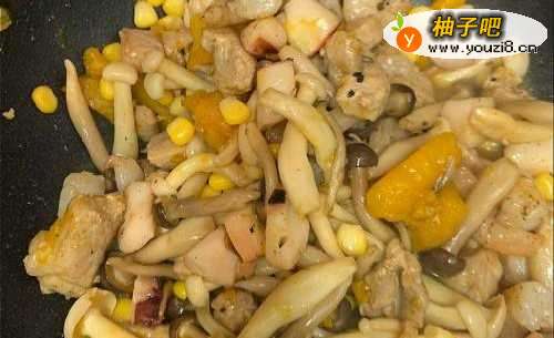 4将肉粒取出,连同其他菇类炒熟,用鸡精、蚝油调味。