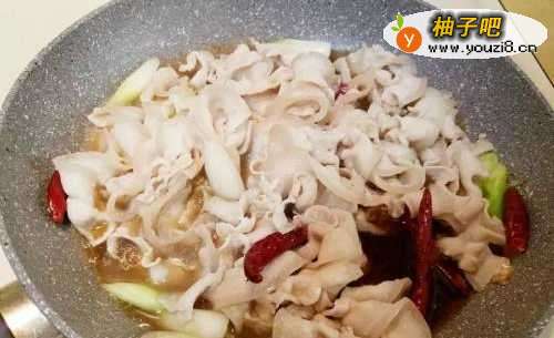 4热锅加2匙油,把姜泥、蒜白及干辣椒下锅爆香,把猪肉片加入快炒,加入酱汁拌匀