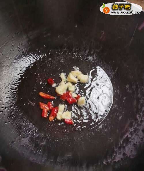 4锅中倒入适量食用油,起小泡后倒入蒜和小米椒爆香