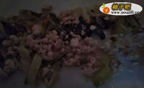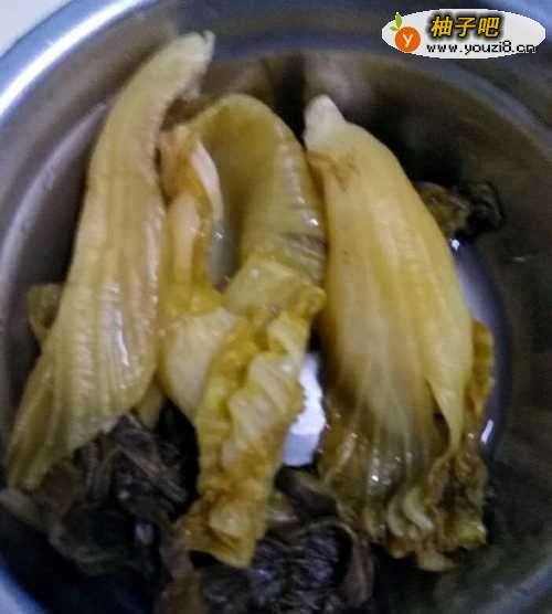 2把酸菜洗干净,切碎,放热油锅里炒香