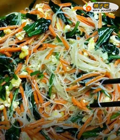4准备胡萝卜丝、白萝卜丝、焯水的菠菜,煮过的粉丝;