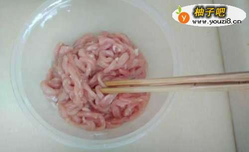 猪肉切丝,少量盐和淀粉腌一下,增加嫩滑,如图: