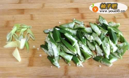 3秋葵切成滚刀块,再切些姜片和葱段备用。