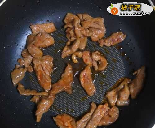 3锅中放少许油,油热后放入肉片翻炒煸白,捞出备用。