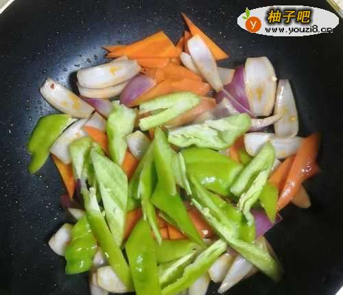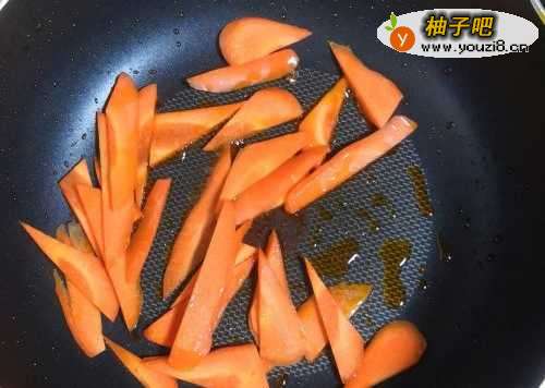 4锅中再淋少许油,油热后放胡萝卜翻炒几下。