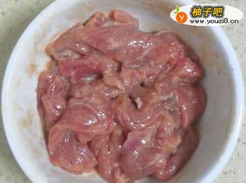 2牛里脊切成片,放入生抽和少许盐加入淀粉抓匀。