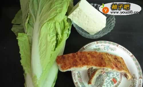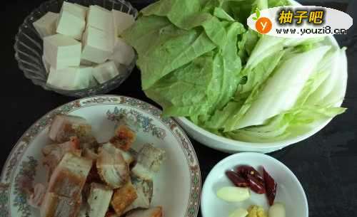 2将烧肉切成小方块,豆腐也切成小方块,白菜洗净切大块。