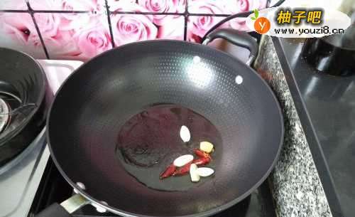 3锅内放油烧热,放红辣椒、姜、蒜爆香。