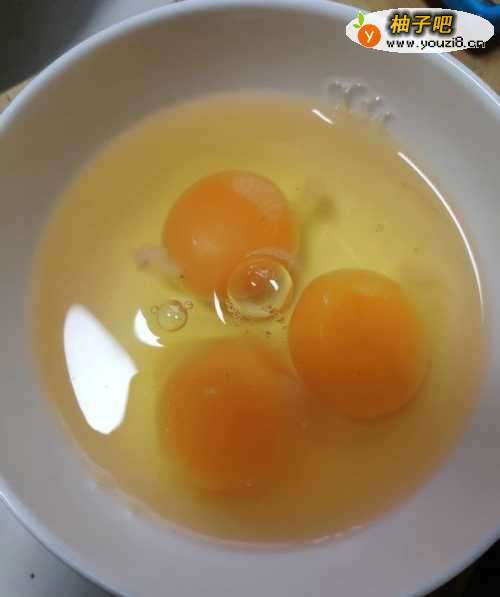 准备三枚鸡蛋,打入碗中,准备一次性放入锅内。