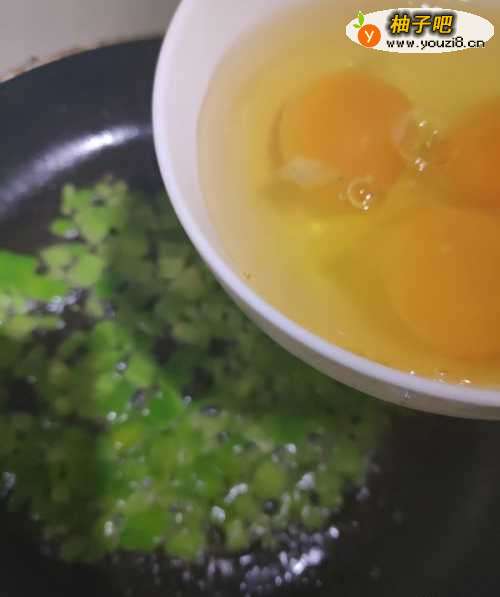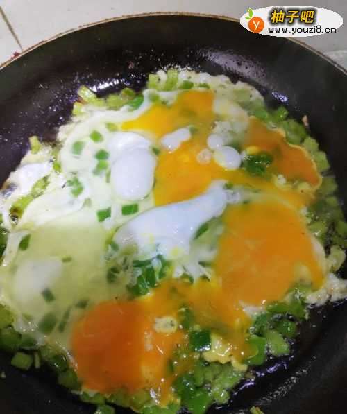 6将辣椒均匀平铺在锅内,开大火,将鸡蛋倒入锅内,用铲子将鸡蛋在锅内铺平。