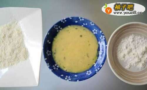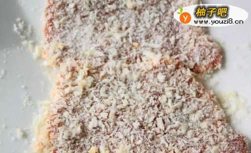 3将腌好的两面均匀沾上中筋面粉后,再沾上打散的蛋液,最后沾上面包粉并稍用力压紧