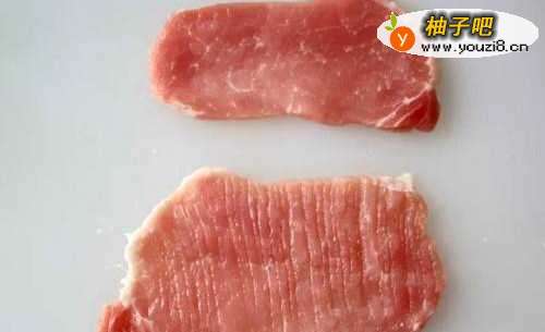 猪排洗净用刀背将猪排拍松,带筋部分用刀划开