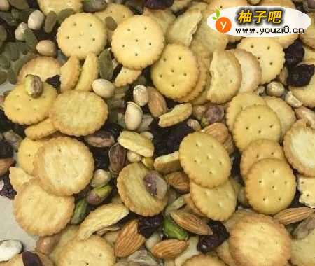 将坚果、果干、饼干放入盘中混合搅拌均匀。