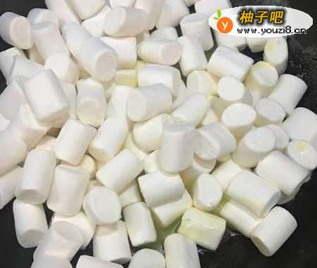 3倒入棉花糖,让棉花糖在锅中不断搅拌到融化。
