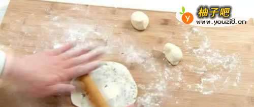55.将面团揉成小面团,再擀成需要大小的面皮,刷上油面糊,将香椿末平铺在面皮上,撒少许椒盐,卷起来,揉成团,再擀成面饼。