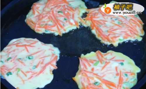 5第五步,平底锅中倒入花生油,用刷子刷匀,搅好后的面糊,用一个小勺舀着倒入,用勺子底部抹平表面,小火煎;