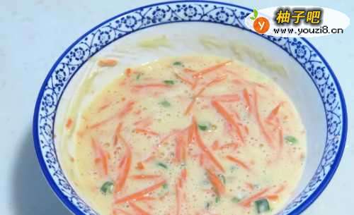 3第三步,打入鸡蛋搅拌均匀,鸡蛋的个数可以是2个也可以是3个,根据人数进行调整;