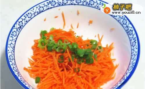2第二步,胡萝卜丝中撒上盐、五香粉,再倒入切好的葱花;