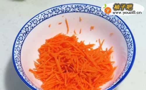 第一步,胡萝卜洗干净去蒂去尾部,如果感觉无法彻底洗净,可以将表皮刮去,用用擦丝器擦成细丝,尽量擦得细一些,待会儿煎时易熟;