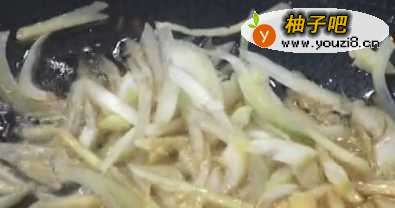 4这时可以开大火了,把刚刚切好的葱姜放入油中炸到泛黄,这是可以放青椒了。