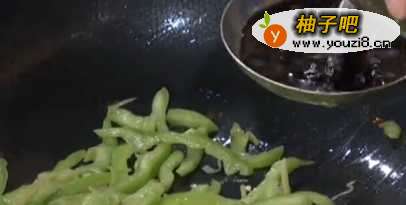 青椒放入后快速翻炒,青椒容易炒塌所以只要把透过颜色变化就可以改小火了。