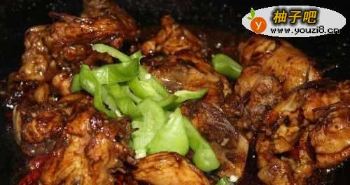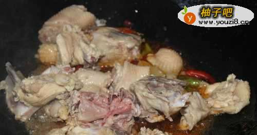 6鸡架八成熟后加入尖椒翻炒。