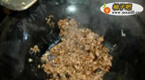 8第八步:葱姜蒜爆炒差不多了,放入肉末,翻炒到变色。