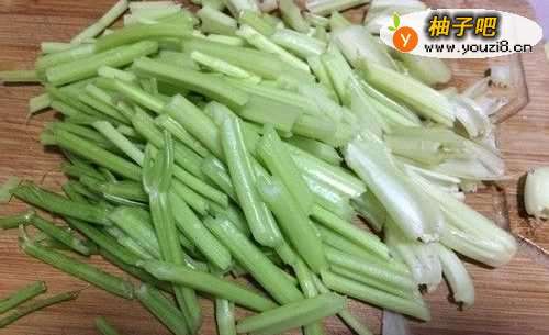 然后斜着刀切,把西芹写成菱形,这样炒起来更入味。