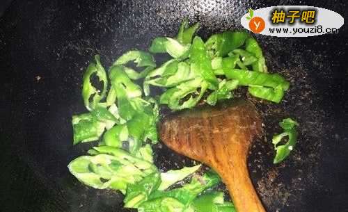 4开火加油,爆香葱花。然后首先倒入辣椒条,可以适当加水。