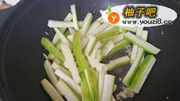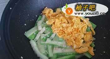 7用漏勺捞出丝瓜抖干一下水分,倒入锅中大火翻炒至丝瓜变软。