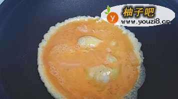 4锅里放入3勺食用油,放入搅散的蛋液。
