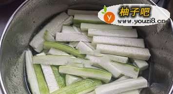 3丝瓜切成细条状,放入淡盐水里浸泡。防止丝瓜氧化变色。