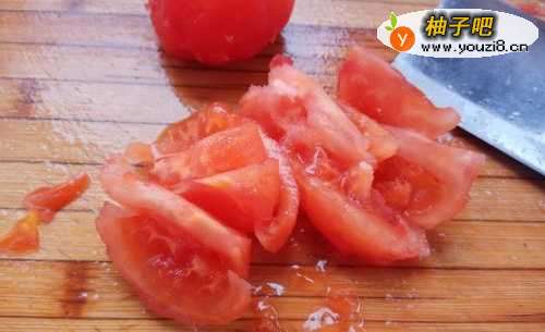 先将西红柿洗干净,然后用热水烫一下去皮,再放在菜板上切成小块。将葱洗干净,切成碎葱花,将姜块洗干净,切成小碎丁。待用。