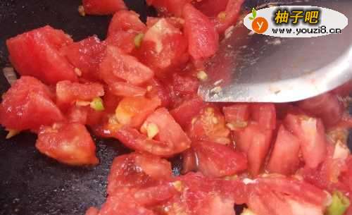 4将炒锅购晃中再放入少许的食用油,将切好的葱、姜放在锅中,炒微黄后,将切好的西红柿放入锅中,加盐翻炒均匀。