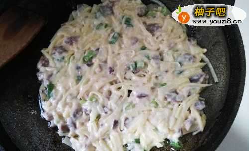 6油热后,把备好的土豆面团放到电饼铛上,按压成饼状,煎好一面再煎另一面。
